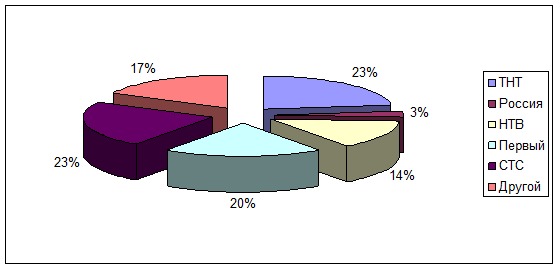 Вывод: Анализ опроса показал, что наиболее предпочитаемый канал это ТНТ и СТС (23%), «Первый» (20%), 17 % предпочитают другой канал, 14% НТВ, 3 % «Россия».