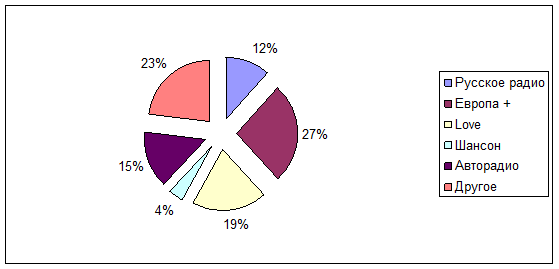 Вывод: Больший процент (27%) имеет радио Европа +, так большинство предпочитают другое радио (23%), (19%) Love радио, (15 %) Авторадио, (12%) Русское радио и только (4%) выбирают радио Шансон.
