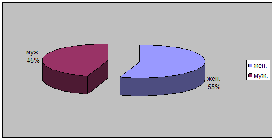 Вывод: Большинство опрошенных, женщины (55%), остальные (45%) мужчины.