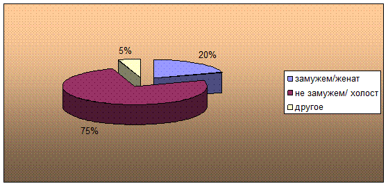 Вывод: Большинство опрошенных респондентов не состоят в браке (75%), респондентов состоящих в браке (20%) и (5%) другое.