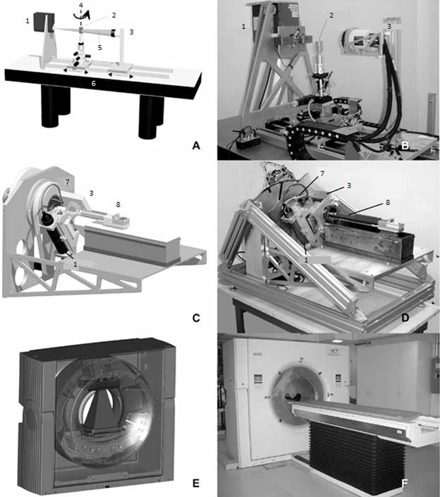 Настольный микро-КТ (A, B) с вращающейся моделью держателя, стационарным детектором области и микрофокусной рентгеновской трубкой, обеспечивающей усиленное излучение. Такая установка в основном используется для проведения лабораторных исследований. Хорошие результаты исследования зависят от оптимального соотношения между полем сканирования, чёткостью, хорошей фиксации животного к столу, при условии вращающегося гентри (C, D). Всё большие требования к пространственному разрешению, быстрому и более широкому сканированию исследуемого поля достигаются и отображаются на плоской панели детектора, крутящегося гентри со стационарным столом (E, F).