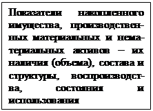 Статистика национального богатства решает задачи. связанные с разработкой системы показателей и обоснованием методологии их исчисления как для всего богатства, так и для отдельных его элементов, а также задачи практической организации статистического наблюдения и обработки полученной информации на разных уровнях в соответствии с принятой системой показателей и методологией их исчисления. Система показателей статистики национального богатства, используемая в анализе, включает в себя следующие основные характеристики: