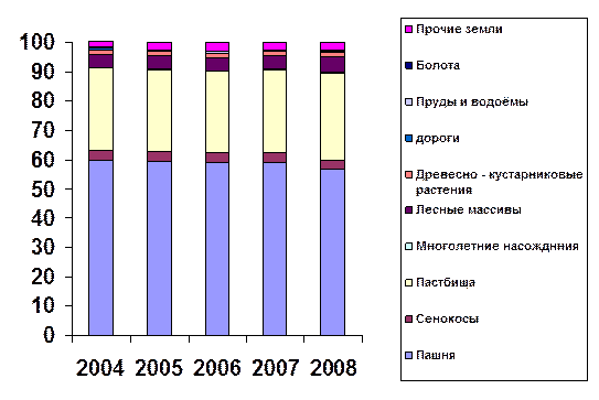 Фактическое наличие и соотношение основных видов сельскохозяйственных угодий установилось еще в начале 60-х годов после освоения целинных и залежных земель. Достаточно сказать, что площадь пашни, увеличившаяся с 1954 по 1964 г. на 1,6 млн. га, в дальнейшем почти не изменилась. Была трансформация сельскохозяйственных угодий, строились дороги и оросительные каналы, сажались лесные полосы и многолетние насаждения, осуществлялись отводы под промышленное и индивидуальное жилищное строительство, но площадь пашни, как правило, поддерживалась на одном уровне за счет освоения и вовлечения в нее части сенокосов и пастбищ. Она преобладает над другими видами угодий во всех районах области и составляет 72% от всей сельскохозяйственной площади, что в три раза выше, чем в среднем по России.