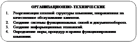 1. Переход от разделения компании на функциональные подразделения к бизнес-процессным командам. Объединение усилий компании по лучшему обслуживанию клиентов достигается через разделение компании на естественные процессы создания страхового продукта, его продажи, послепродажное обслуживание и т. д.