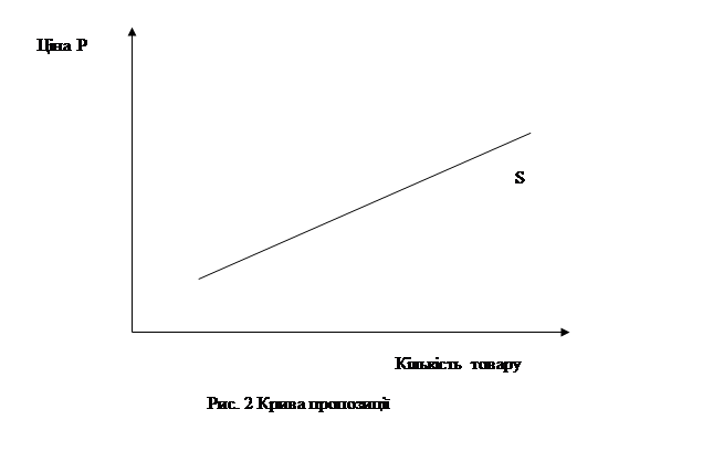 Крива пропозиції відбиває закон зростання граничних витрат. Вона має позитивний нахил, тому що обсяг пропозиції росте при збільшенні ціни (рис.2.)
