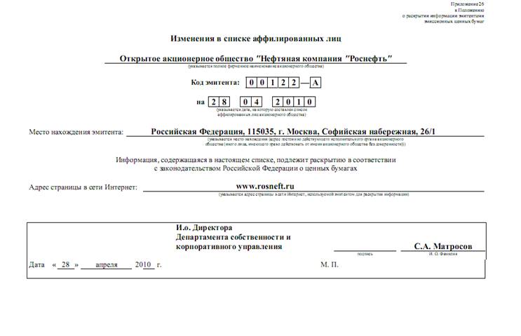 Состав акционеров (держателей акций) ОАО «НК «Роснефть», владеющих более 1% уставного капитала Компании по состоянию на 1 апреля 2010 г.: