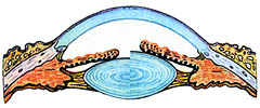 - внутренняя. Склера имеет белый цвет с молочным отливом, кроме передней ее части, которая прозрачна и называется роговицей. Через роговицу свет поступает в глаз. Сосудистая оболочка, средний слой, содержит кровеносные сосуды, по которым кровь поступает для питания глаза. Прямо под роговицей сосудистая оболочка переходит в радужную оболочку, которая и определяет цвет глаз. В центре ее находится зрачок. Функция этой оболочки - ограничивать поступление света в глаз при его высокой яркости. Это достигается сужением зрачка при высокой освещенности и расширением - при низкой. За радужной оболочкой расположен хрусталик, похожий на двояковыпуклую линзу, который улавливает свет, когда он проходит через зрачок и фокусирует его на сетчатке. Вокруг хрусталика сосудистая оболочка образует ресничное тело, в котором заложена мышца, регулирующая кривизну хрусталика, что обеспечивает ясное и четкое видение разноудаленных предметов. Достигается это следующим образом (рис.3).