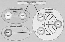 –B–клеткам селезёнки или пейеровых бляшек, стимулированных ЛПС, селективно усиливает продукцию IgA, ИЛ–2 и ИЛ–5 существенно повышают стимулирующий эффект этого цитокина. Усиливающая роль ТФР в синтезе IgA доказана, но окончательно не установлено, какие именно факторы участвуют в переключении генов в B–клетках, локализованных в пейеровых бляшках [591]. Возможно, это межклеточные взаимодействия CD40–CD40L, а также комплекс цитокинов и биологически активных веществ кишечника типа вазоактивных пептидов, которые, как было показано, стимулируют синтез IgA в sIgA–