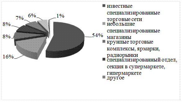Основным местом покупки бытовой техники являются магазины, которые входят в известные специализированные торговые сети. Там совершают покупки 54% россиян. В их число входят жители крупных городов, люди трудоспособного возраста с образованием не ниже среднего и высоким уровнем дохода. 16% россиян приобретают технику в небольших специализированных магазинах. Крупные специализированные торговые комплексы, ярмарки и радио рынки популярны у 8% россиян. 8% - в специализированном отделе, секции супермаркета или гипермаркета, 6% - в специализированном отделе универмага или торгового дома, 1% россиян приобретают технику через интернет, по телефону или по каталогу (рисунок 2).