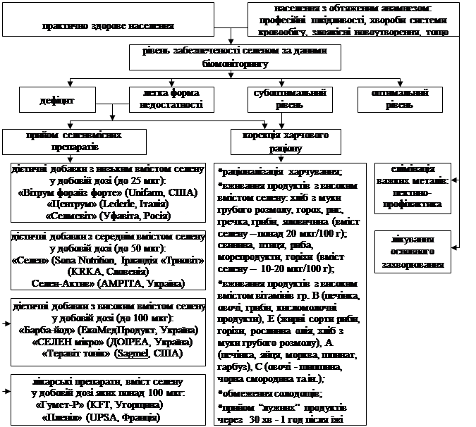 На основі проведених досліджень та аналізу даних літератури обґрунтовано комплекс заходів по нормалізації селенового статусу у населення індустріально розвинутих територій (схема 1).