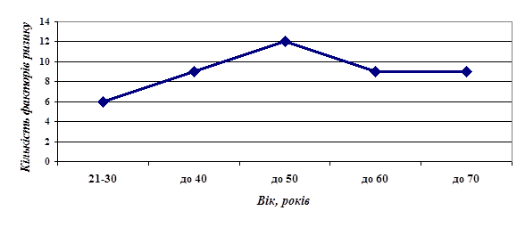 3. Проведений аналіз даних анкетного скринінгу показав накопичення факторів ризику з (20–30)- до (40–50)-річного віку, що свідчить про необхідність початку заходів вторинної профілактики з цього віку, а проведення селективного скринінгу – з 40 років. Доведено, що за допомогою опитування жінок згідно з розробленою анкетою формуються «групи ризику», вивчаються як індивідуальні фактори ризику, так і загальний стан здоров’я жінок регіону, розробляються заходи впливу на керовані та умовно керовані фактори ризику.