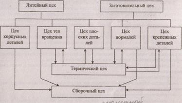 • нарушается принцип прямоточности, затрудняется согласование работы цехов, в связи с удлинением маршрутов движения предметов труда в заготовительных и обрабатывающих цехах;