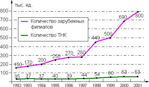 По состоянию на начало 2004 в мире действовало 64 тыс. ТНК, контролирующих 830 тыс. иностранных филиалов. Для сравнения: в 1939 насчитывалось всего около 30 ТНК, в 1970 – 7 тыс., в 1976 – 11 тыс. (с 86 тыс. филиалов).