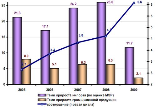 За последние годы быстрый экономический рост, базировавшийся на притоке внешнеэкономических доходов, маскировал потерю позиций российских компаний на внутренних и внешних рынках. Это проявлялось в опережающем росте импорта по отношению к расширению основных рынков – потребительского и инвестиционного (см. рис. 3)