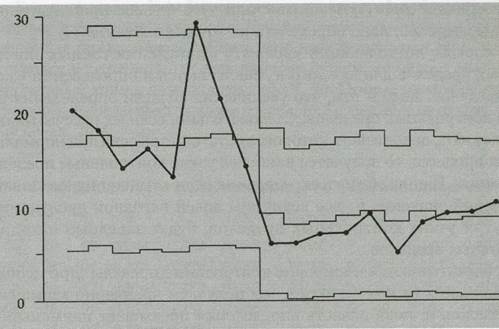 Хотя контрольные карты на рис. 4 и 5 говорят об одном и том же, выглядят они совершенно по-разному. Меняющаяся центральная линия на рис. 5 затрудняет интерпретацию этой карты. В этом и состоит главная причина редкого использования карт с неравными областями определений.