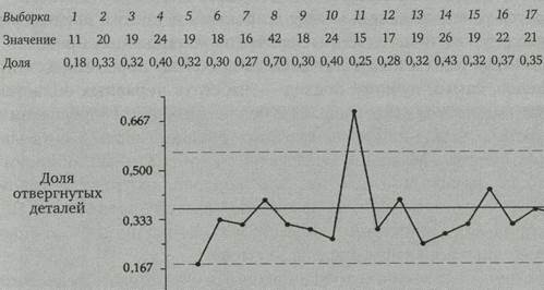выражается тысячами, то практически невозможно получить как р-карты, так и nр-карты, которые показывали бы разумную степень статистической управляемости. Причин этого явления может быть много, но почти все они связаны с корректностью постановки задачи: что именно подсчитывается? Если некий контролер проверяет всю продукцию подряд, то может возникнуть проблема усталости: то, что кажется негодным в 9