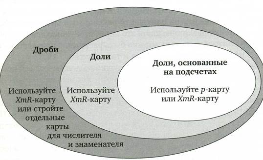 Точно так же дроби, которые не являются долями, не годятся для р-карт. Все доли — дроби, но не все дроби — доли. Дробь можно считать долей тогда, когда знаменатель будет описывать область определения для значений числителя.