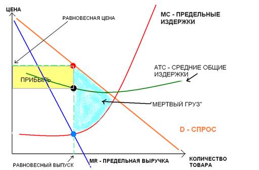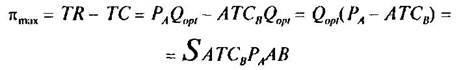 Точка пересечения графиков MR и МС (точка Е) и ее параметр Qopt отражает оптимальный объем производства. Причем Qopt на данном рисунке и на рисунке выше количественно совпадут. Далее по графику Dx определяем, по какой цене данный объем производства Может быть реализован монополистом, это параметр точки А — РА. Проекция точки В на ось ординат (АТСВ) отражает величину средних валовых издержек, соответствующих объему Qopt Таким образом, валовой доход монополиста будет соответствовать площади прямоугольника OPAQopt, а величина валовых издержек — площади прямоугольника OATCBBQopt Прибыль рассчитаем следующим образом:
