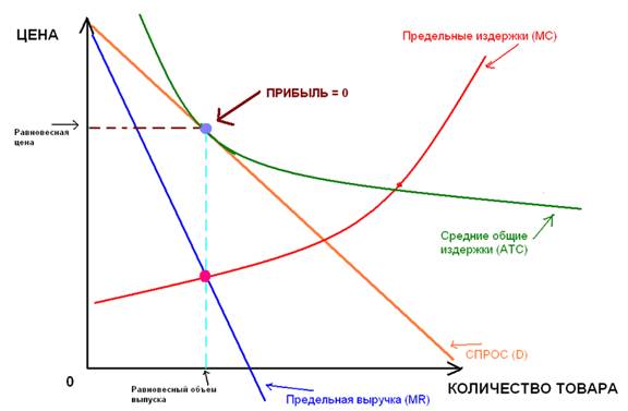 3. Свобода входа в отрасль (на рынок) и выхода из нее. Поскольку в условиях монополистической конкуренции фирмы обычно небольшие по размеру, то чаще всего нет финансовых проблем при вступлении на рынок. С другой стороны, при монополистической конкуренции могут возникнуть дополнительные расходы, cвязанные с необходимостью выделить свой товар (например, расходы на рекламу), что может стать препятствием для входа новых фирм. Существование свободного входа фирм в отрасль приводит к тому, что в результате конкурентной борьбы становится типичной ситуация, когда предприятия в долгосрочном периоде не получают экономических прибылей, функционируя в точке безубыточности.