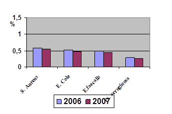 Известно, что повсеместное использование антибиотиков широкого спектра действия оказывает влияние на бактериальную флору, вызывая селекцию резистентной популяции из локуса инфекции или эндогенной микрофлоры пациента. Резистентные штаммы микроорганизмов могут передаваться от пациента к пациенту через руки и окружающую среду при нарушении санитарно–гигиенического режима в хирургическом отделении. Известно, что при пребывании пациента в хирургическом стационаре в течение 48 часов происходит заселение его биологических экониш (кожа, слизистые дыхательных путей и желудочно–кишечного тракта) госпитальными штаммами микроорганизмов.