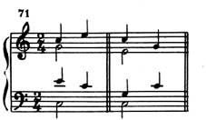 в) врахувати, що висхідний стрибок на квінту або сексту потребує переходу від тісного розтушування до широкого, а низхідний - від широкого до тісного; до всіх таких моментів слід наперед приготувати необхідне розташування. Це цілком можливо, оскільки до появи такого широкого стрибка в мелодії є звичайно ходи на терцію або кварту, при яких, як вже відомо, розташування може або залишатися незмінним, або ж переходити з тісного в широке і навпаки - згідно необхідності до моменту широкого стрибка. Якщо ж такий широкий стрибок представляє перший в даній мелодії випадок переміщення, то необхідно встановити розташування початкового акорду.