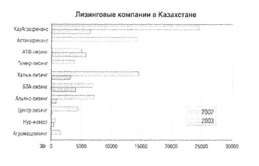 Ведущими лизинговыми компаниями (в т.ч. банки, занимающиеся лизингом) по результатам работы за 9 мес. 2004 года (без учета ЗАО «Казагрофинанс») по объему переданных в лизинг основных средств являются (по убыванию) Астана Финанс, БТА Лизинг, Халык Лизинг, Центр Лизинг, Вираж Лизинг. По результатам работы за 2003 год ситуация выглядела следующим образом: Астана финанс, Валют Транзит Банк, Халык Лизинг, Альянс Лизинг, БТА Лизинг.