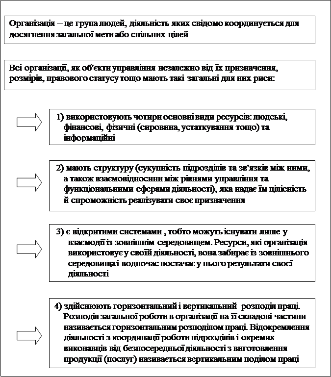 1. Надати уявлення про природу та основні характеристики організації як об'єкту управління. З¢ясувати причини, що обумовлюють необхідність управління організацією.