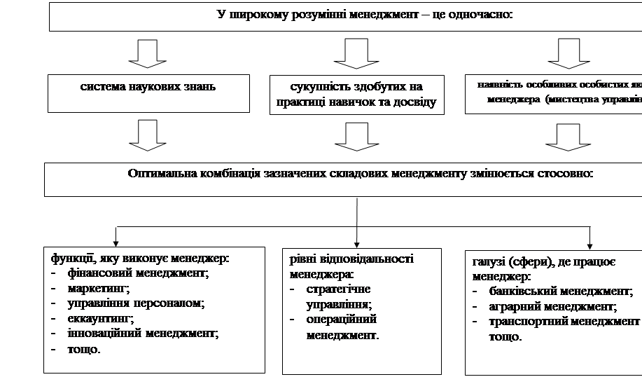 У широкому розумінні, яке певною мірою узагальнює різні точки зору, менеджмент – це одночасно система наукових знань, мистецтва та досвіду, втілених у діяльності професійних менеджерів для досягнення цілей організації шляхом використання праці, інтелекту і мотивів поведінки інших людей. У вузькому розумінні, яке у нашому випадку переслідує конкретну мету – вивчення дисципліни “Менеджмент”, цю категорію можна визначити як процес планування, організацію, мотивацію й контролю організаційних ресурсів для результативного та ефективного досягнення цілей організації. Детальний розгляд змісту, складових елементів, етапів та інструментів реалізації функцій управління і взаємозв'язків між ними покладено в основу навчальної програми дисципліни “Менеджмент”.