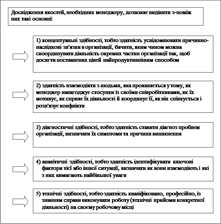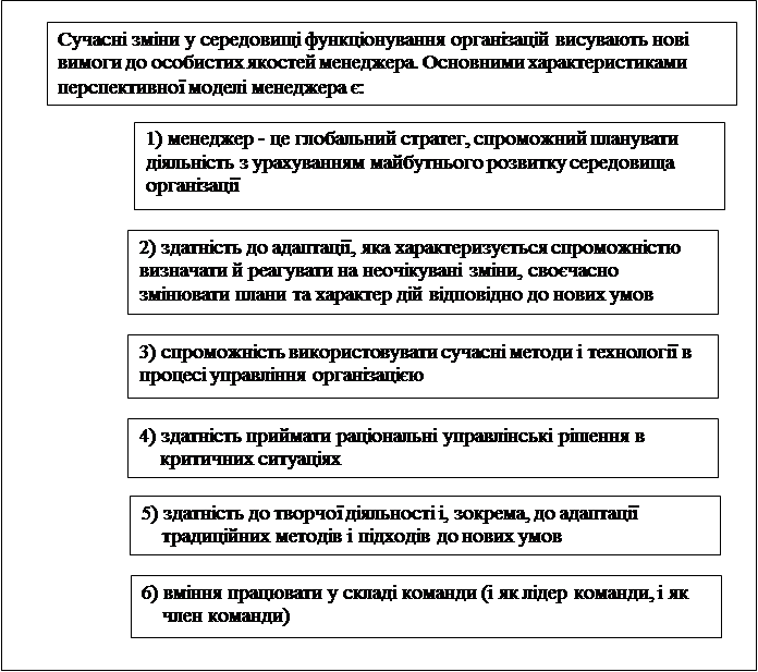 Необхідно також усвідомлювати, що управлінська діяльність як специфічний вид діяльності, незалежно від рівня і сфер менеджменту, вимагає і певних особистих якостей, необхідних менеджеру. Основними з них, на думку більшості спеціалістів, є: концептуальні, діагностичні, аналітичні і технічні здібності, а також здатність взаємодіяти з людьми. Суттєві зміни в середовищі функціонування організації висувають нові вимоги до сучасних менеджерів, до їх освіти, практичних навичок, підготовки. З цієї точки зору, доцільно звернути увагу на перспективну модель менеджера, основні характеристики якої вказують на пріоритети у підготовці студентів як майбутніх менеджерів.