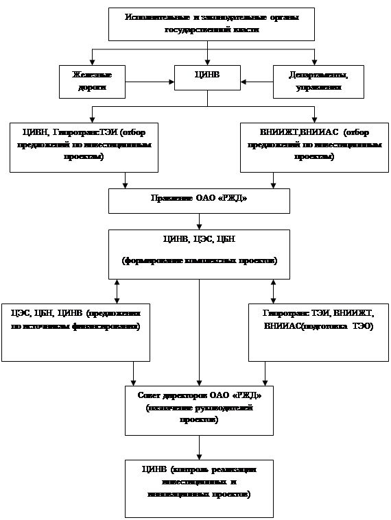 Инвестиционная программа должна базироваться на предложениях департаментов, железных дорог (филиалов ОАО «РЖД»), отдельных предприятий с учетом их последующего отбора основным руководящим органом, отвечающим за формирование всей инвестиционной программы корпорации, - Департаментом инвестиционной деятельности (ЦИНВ). Отбор целесообразно осуществлять путем всестороннего анализа влияния отдельных проектов и их путем всестороннего анализа влияния отдельных проектов и их частей на основные экономические показателя функционирования ОАО «РЖД». При формировании инвестиционных программ должны также приниматься к рассмотрению и учету предложения федеральных, региональных и местных органов исполнительной и законодательной власти, касающиеся вопросов развития транспортной системы. При формировании инвестиционной программы ОАО «РЖД» (СХЕМА 1) необходимо исходить из условий включения в нее, вновь начинаемых проектов только при достаточности ресурсов на осуществление и завершение уже начатых проектов. Важным элементом формирования инвестиционной программы является назначение руководителей комплексных проектов, отвечающих за осуществление проекта в целом с момента его утверждения до завершения и его корректировку при наличии существенных изменений внешних и внутренних факторов, влияющих на проект, а также органа, контролирующего реализацию проектов.