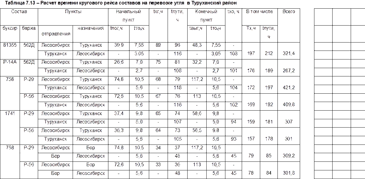 При анализе расчетов, возможно сделать вывод, что при рассматриваемой схеме организации перевозок, наиболее выгодным вариантом являются перевозки на теплоходах проекта 758А и несамоходных судах проекта Р-56. Имея меньшую регистровую грузоподъемность чем баржи проекта Р-29, на 200 тонн, эти баржи на перевозках угля имеют большую эксплуатационную загрузку на 182 тонны, т.к. баржи проекта Р-56 являются судами –площадками, и при высоте штабеля угля до 4 метров, имеют возможность загружаться до установленной проектом грузоподъемности. Несамоходные суда проекта Р-29 относятся к типу бункерных судов, и объем бункера этих судов не позволяет загрузить достаточное для установленной грузоподъемности количество угля. Глубины судового хода на линии Лесосибирск-Туруханск загрузку судов не ограничивают.