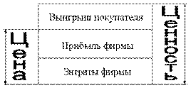 Фирма стремится обеспечить максимальную разницу между ценностью товара для покупателя, которую он готов оплатить, и затратами, которые необходимы фирме, чтобы изготовить товар с такими свойствами. Задача ценообразования состоит в том, чтобы как можно большая часть этой разницы превратилась в прибыль фирмы и как можно меньшая - в выигрыш покупателя (рис.1).