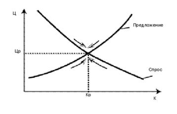 Классическая модель спроса и предложения представлена на рисунке 2, где Ц — цена, а К — количество купленного/произведенного товара.