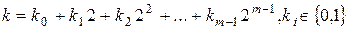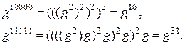 як -розрядне двійкове число . Наприклад, мінімальним 5-розрядним числом (з 1 у старшому розряді) є двійкове число (рівне 16 у десятковій системі), а максимальним – число 11111 (рівне 31 у десятковій системі). Тоді експоненціювання елемента зводиться до послідовного піднесення до квадрата і множення на (останнє за наявності 1 у двійковому записі від старшого розряду до молодшого):