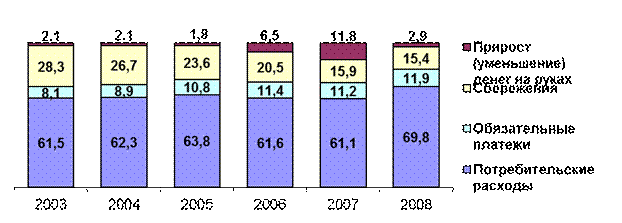 В структуре расходов населения за последние годы произошли определенные изменения. Так, расходы на потребительские цели в 2008 году, по сравнению с 2003 годом, увеличились на 8,3 п.п., расходы на оплату обязательных платежей и добровольных взносов на 3,8 п.п. Отмечается снижение доли сбережений на 12,9 п.п. На рисунке 9 продемонстрировано использование денежных доходов населения (в процентах от общего объема денежных доходов).