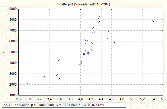 Показники № 1, 2, 3 та № 36, 35, 34 різко відрізняються від всіх інших спостережень. Тому поступово відкидаючи їх один за одним і перераховуючи коефіцієнт варіації для показників Y, X1 ми дійшли висновку, що всіх їх необхідно виключити із сукупності. Лише в цьому випадку коефіцієнт варіації для даних показників буде задовольняти необхідну умову k вар ≤ 33%.
