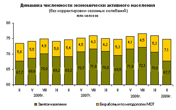 Численность экономически активного населения в возрасте 15-72 лет (занятые + безработные) в феврале 2009г. составила 74,8 млн.человек, или 53% от общей численности населения страны.