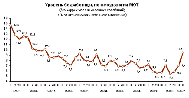 Уровень безработицы, исчисленный как отношение численности безработных к численности экономически активного населения, в феврале 2009г. составил 9,5% и был на 2,5-2,4 процентного пункта выше, чем в ноябре 2008г. и феврале 2008 года. [См. приложение 2]