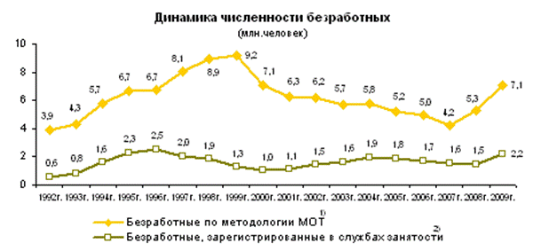 В России с октября 2008 года, то есть с момента обострения кризиса, сообщили об увольнениях более 32 тысяч организаций. За полгода были сокращены 314 тысяч человек. Кроме того, так называемых "скрытных" безработных, то есть находящихся в вынужденном отпуске или работающих неполный рабочий день, в России уже насчитывается 1,24 миллиона человек.