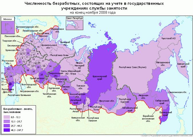 К концу декабря 2008 года по сравнению с концом декабря 2007 года число безработных, состоящих на учете в государственных учреждениях службы занятости населения, выросло более чем на 25% - в Пермском крае, Владимирской, Калининградской, Ленинградской, Нижегородской, Свердловской и Тверской областях. [См. приложение 3]
