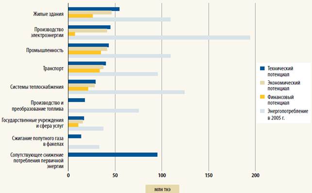 Наибольшим техническим потенциалом повышения энергоэффективности обладают жилые здания, производство электроэнергии и промышленность. На Рис. 2 показан потенциал повышения энергоэффективности по секторам .