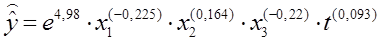 По формальным критериям аппроксимации были определены наиболее оптимальные методы прогноза, с помощью которых были спрогнозированы уровни факторных признаков на 2008-2012 гг. Для прогнозирования значений коэффициента обеспеченности денежной массы произведенными товарами (услугами) была выбрана экспоненциальная функция, уравнение которой имеет следующий вид: