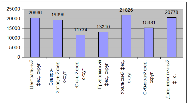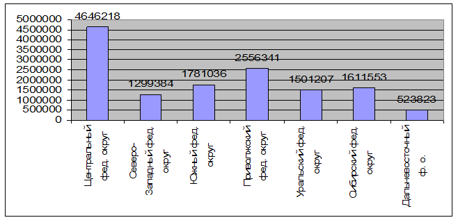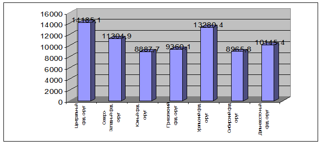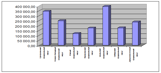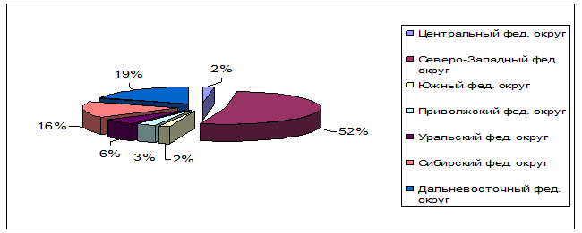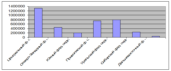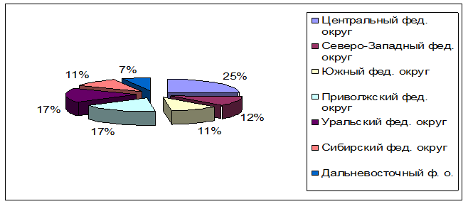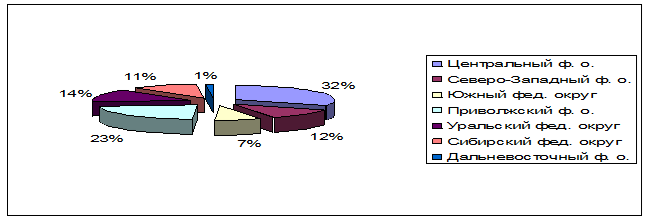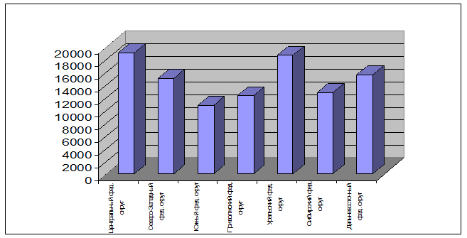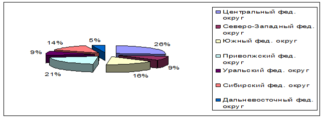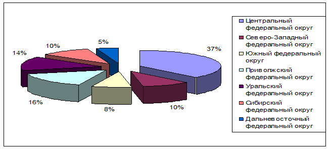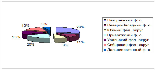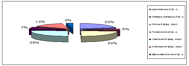 На первом месте находится Центральный округ, на втором – Приволжский округ, на третьем – Уральский округ, на четвертом – Северо-Западный округ, отставая на 1% от Северо-Западного на пятом месте держится Сибирский округ, на шестом – Южный, и на последнем месте находится Дальневосточный округ.