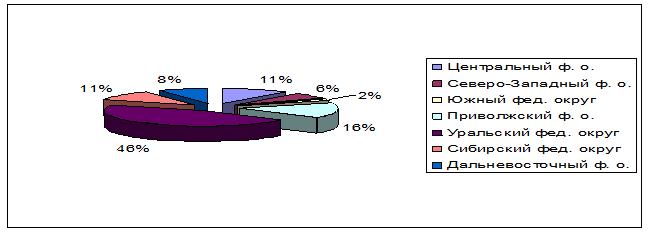 Основную долю забирает Уральский округ с 46%, наименьший вклад осуществляет Южный округ.
