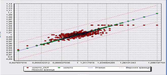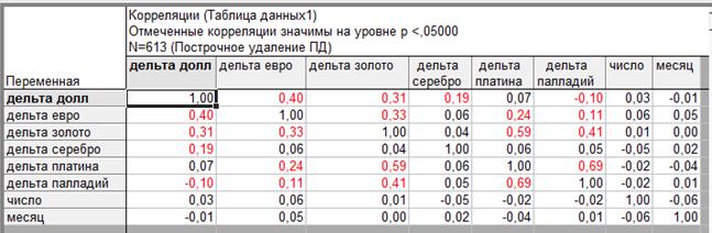 Как видно из рисунка 2 – практически все выбранные нами параметры статистически значимы при построении данной модели. Также можно заметить и то, что из входных данных наиболее сильно между собой связаны изменения курсов платины и палладия, но, в свою очередь, эти два показателя имеют достаточно сильную связь с результатирующим признаком.