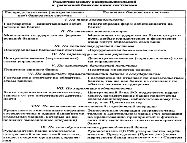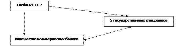 Итак до 1987 года в СССР существовало четыре банка: Госбанк, Стройбанк, Внешторгбанк, Гострудсберкассы. Эмиссионные, управленческие и контрольные функции, а также краткосрочное кредитование, расчетно-кассовое обслуживание выполнял Госбанк СССР. В нем автоматически аккумулировались свободные денежные средства, распределяемые между экономическими субъектами по заранее утвержденному кредитному плану. Госбанк был, ориентирован в основном на выполнение этого плана своей филиальной сетью и нёс ответственность только перед вышестоящими органами, а не клиентурой.