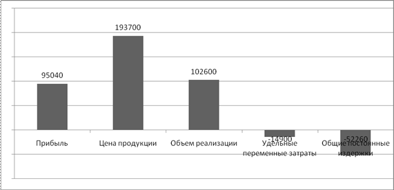 Рост прибыли, отраженный на рисунке 11, в большей мере был обеспечен увеличением объема реализованной продукции, что дало прирост прибыли на 102600 тыс. руб. Увеличение общих постоянных издержек в абсолютном выражении оказало незначительное влияние на исследуемый показатель. Значительно больший отрицательный эффект характерен для удельных переменных затрат, рост которых повлек за собой снижение величины прибыли на 14900 тыс. руб. Этот фактор компенсируется ростом прибыли на 193700 тыс. руб. за счет увеличение цены реализации.