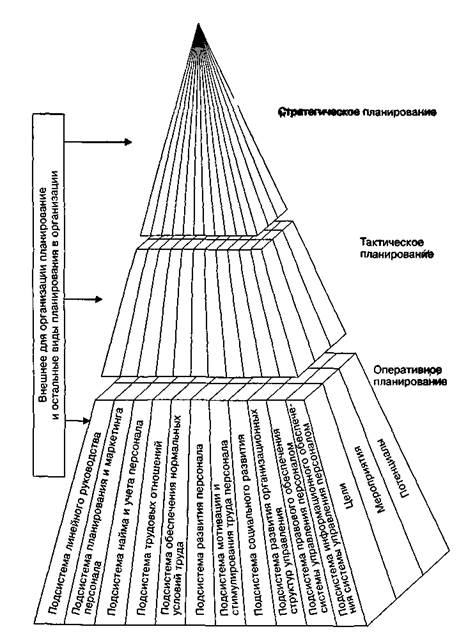 Кадровое планирование имеет много измерений. Помимо временного подразделения на долгосрочное, среднесрочное и краткосрочное важным является подразделение планирования на стратегическое, тактическое и оперативное. Каждый из этих видов планирования имеет свои цели, мероприятия и потенциалы по группам функций каждой подсистемы системы управления персоналом. Эти измерения образуют иерархическую многомерную структуру кадрового планирования, схема которой представлена на рис. 3 как трехмерное изображение.