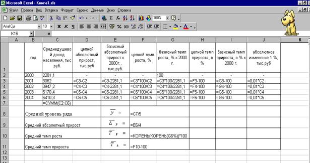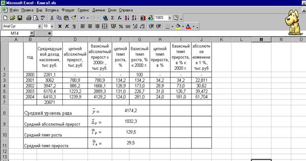 Расчеты показателей анализа ряда динамики среднедушевого денежного дохода населения России в месяц выполнены с применением пакета прикладных программ обработки электронных таблиц MS Excel в среде Windows.