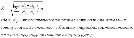 – относительные показатели структуры изучаемых совокупностей в отчетном и базисном периодах соответственно; n – число структурных составляющих (групп).